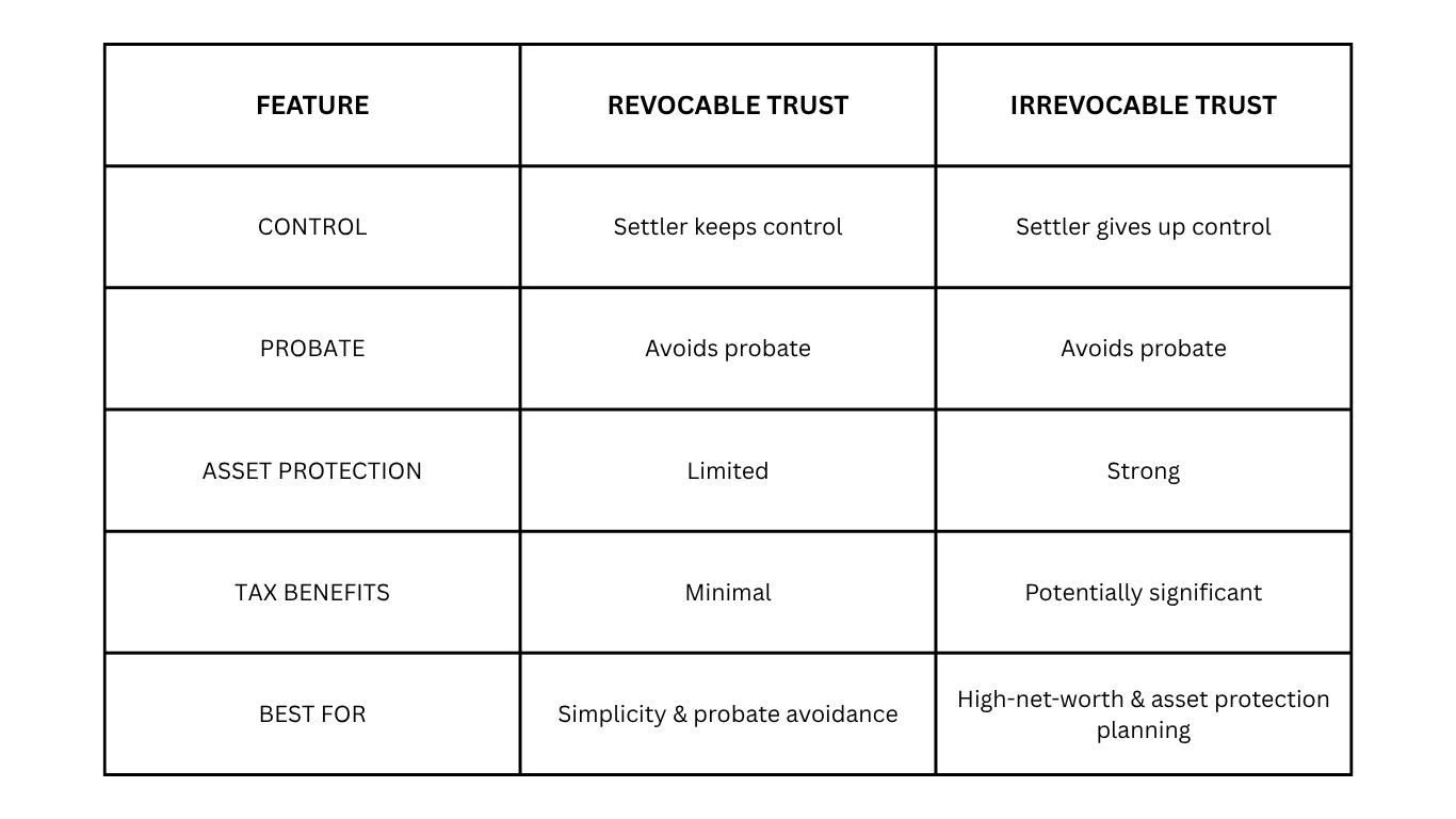 Revocable trusts allow control but limited protection; irrevocable trusts give stronger asset protection and tax benefits.